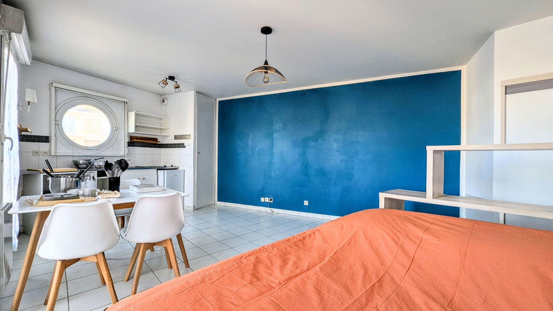 Au cinquième et dernier étage avec ascenseur, un appartement meublé d’une pièce comprenant entrée, séjour avec cuisine ouverte, dégagement avec placard, salle d’eau avec WC et lave-linge séchant.